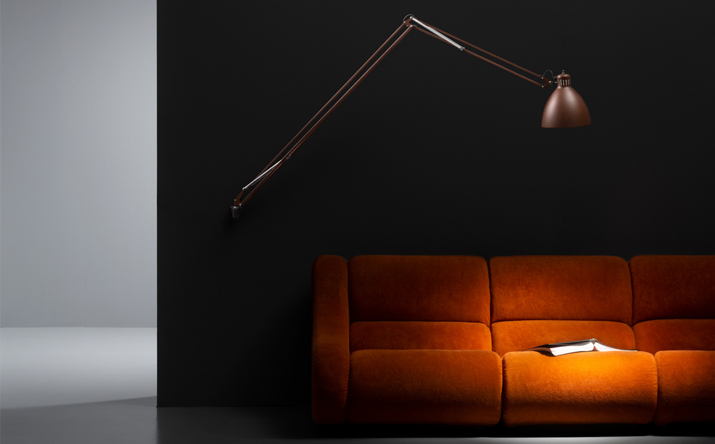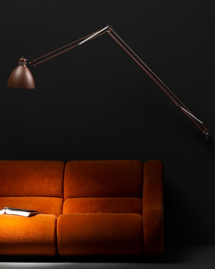 The JJ wall lamp features a matte lacquered steel frame and with aluminium diffuser, enabling fluid positioning and direction of light. The lamp is available in six colours, white, black, amaranth red, mica blue, sablé grey and rust brown, with the interior of the diffuser finished in white lacquer for a clean, bright light. Lamp is available as a dimmable or on/off switch on the diffuser.