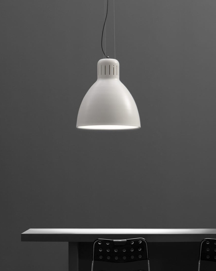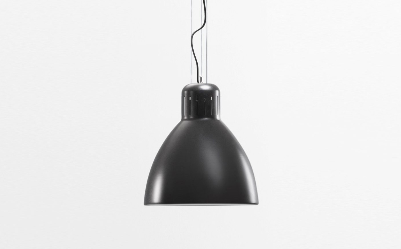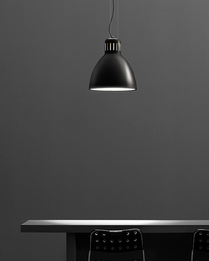 The JJ pendant lamp carries forward the collection’s iconic design language, freeing the shade from the cantilevered frame of it's cousins to function as a suspension down light. The aluminium pendant is available in two sizes, with a matte finish in any of six striking colours; black, white, blue, red, grey, and brown. The white lacquered interior enhances light diffusion, while the dimmable LED light source provides versatile illumination options.