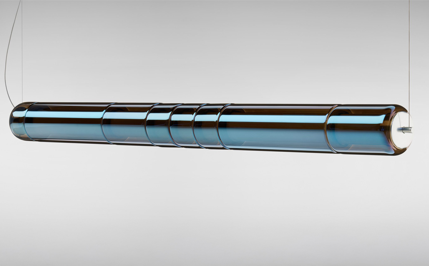 Designed by David Rockwell, the Stacking Collection merges traditional Venetian glassmaking with modern design. Stacking horizontal pendants feature a cylindrical diffuser illuminated by five LED strips. The decorative elements are crafted from hand-blown borosilicate glass, while machined aluminum end caps not only hold the design together but also serve as suspension anchors. The fitting has a diameter of 100mm and comes in two lengths: 1200mm and 1800mm. The glass diffuser is available in three finishes: transparent, metallic petrol blue, and metallic titanium. The sleek metal structure is offered in two finishes: matte black and anodised aluminum.