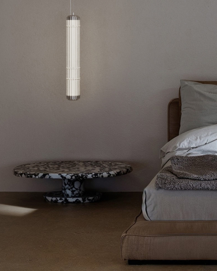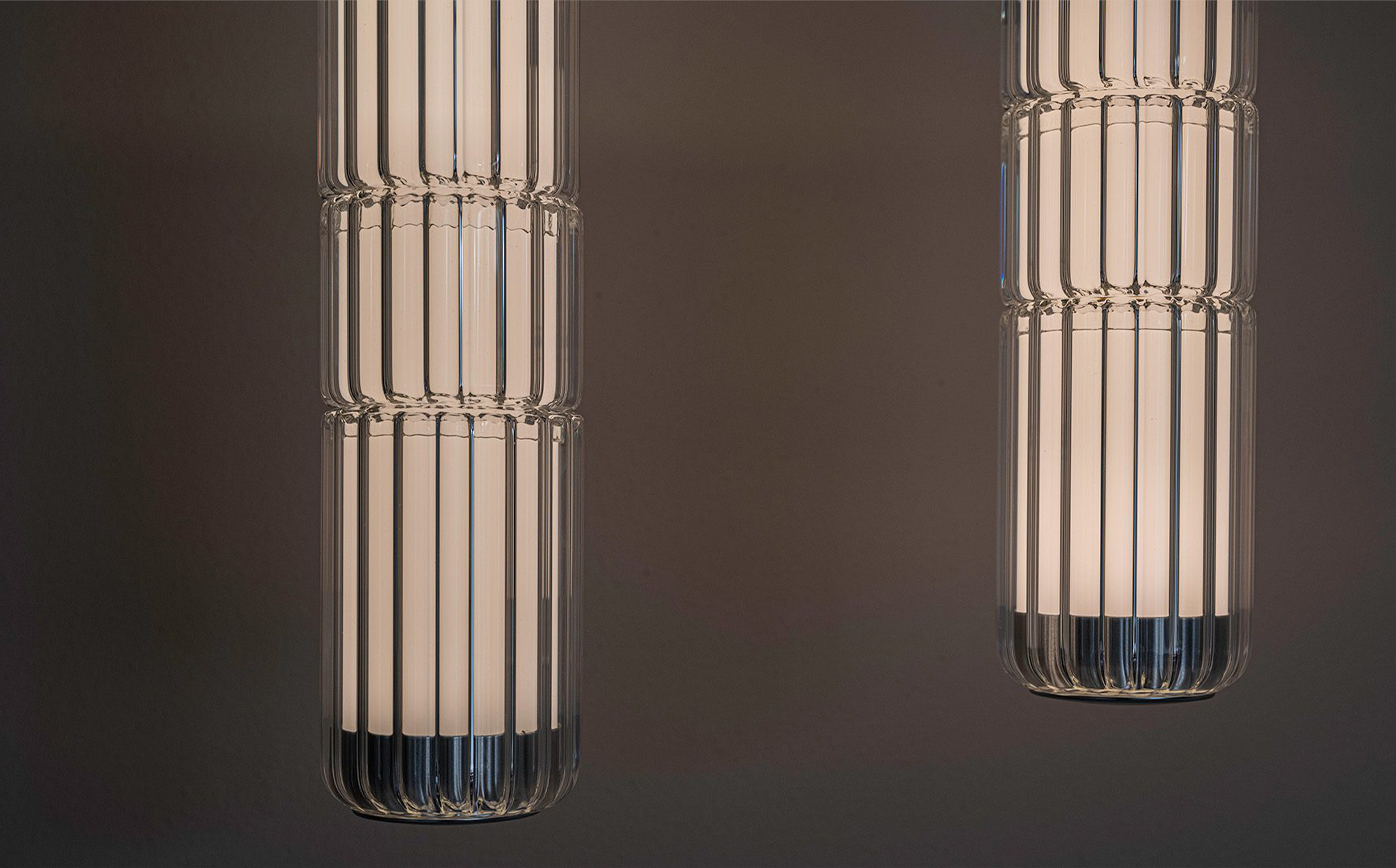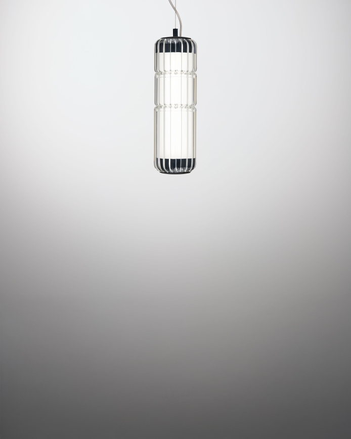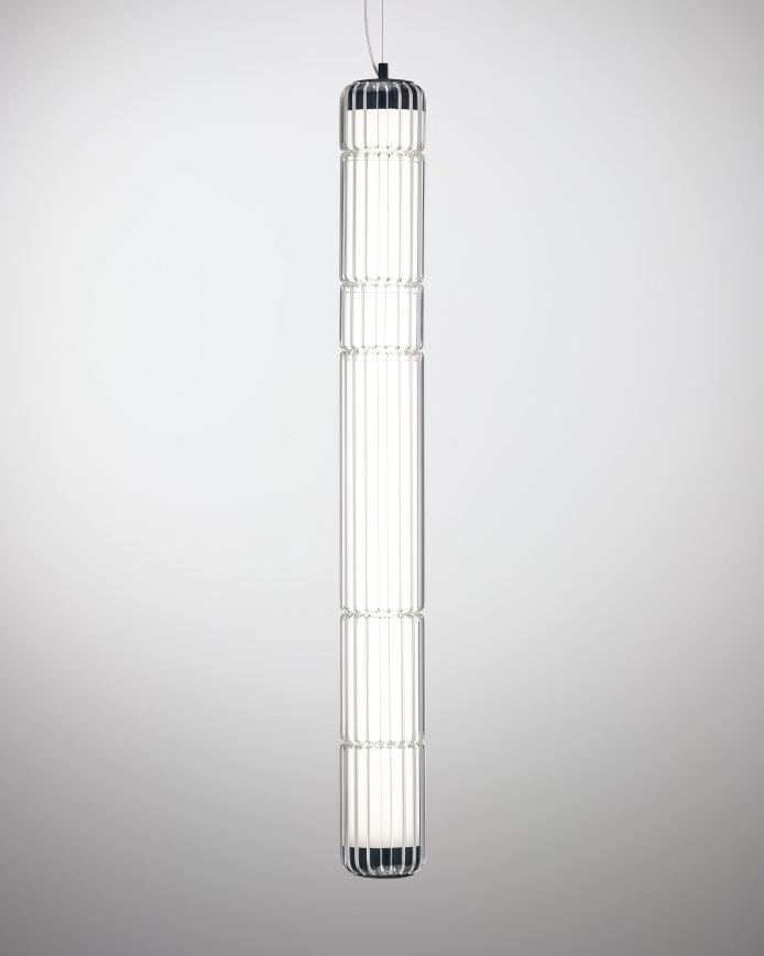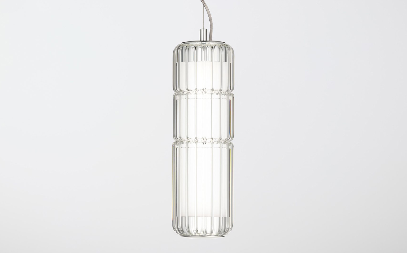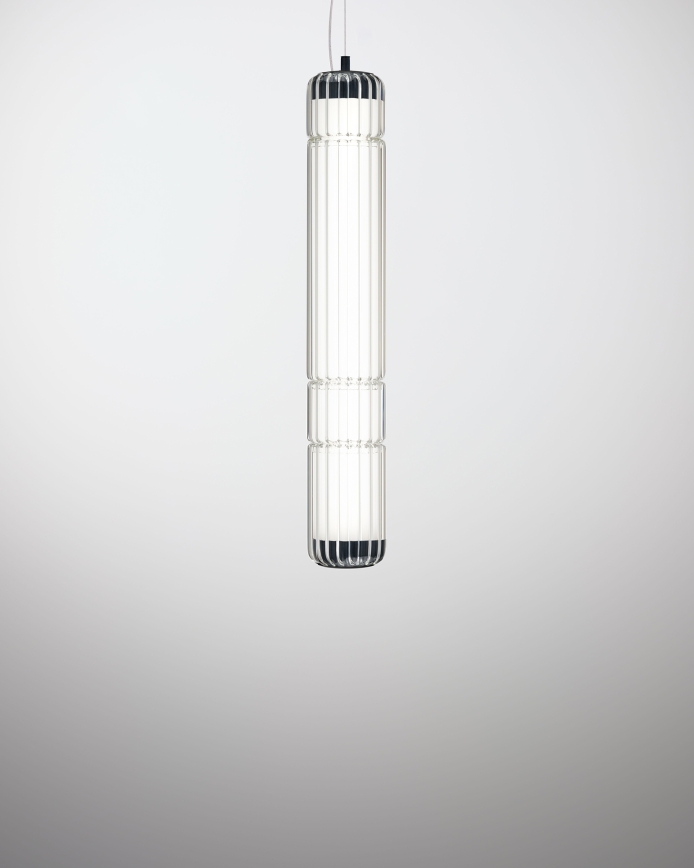 In 2024, the Stacking Vertical Pendant Rig debuts, showcasing ribbed borosilicate glass for an enhanced lighting effect. Available in transparent glass, this version offers an elegant addition to the Stacking Collection. The fitting has a diameter of 100mm and comes in three heights: 300mm, 600mm and 900mm. Machined aluminium end caps, in matte black or anodised aluminium finish, hold the design together and also serve as suspension anchors.