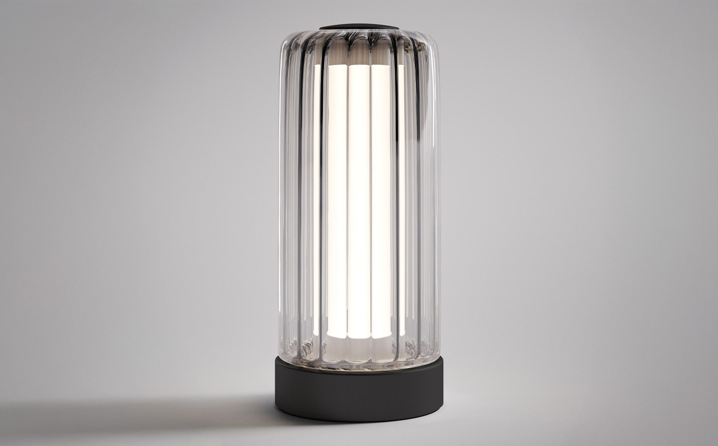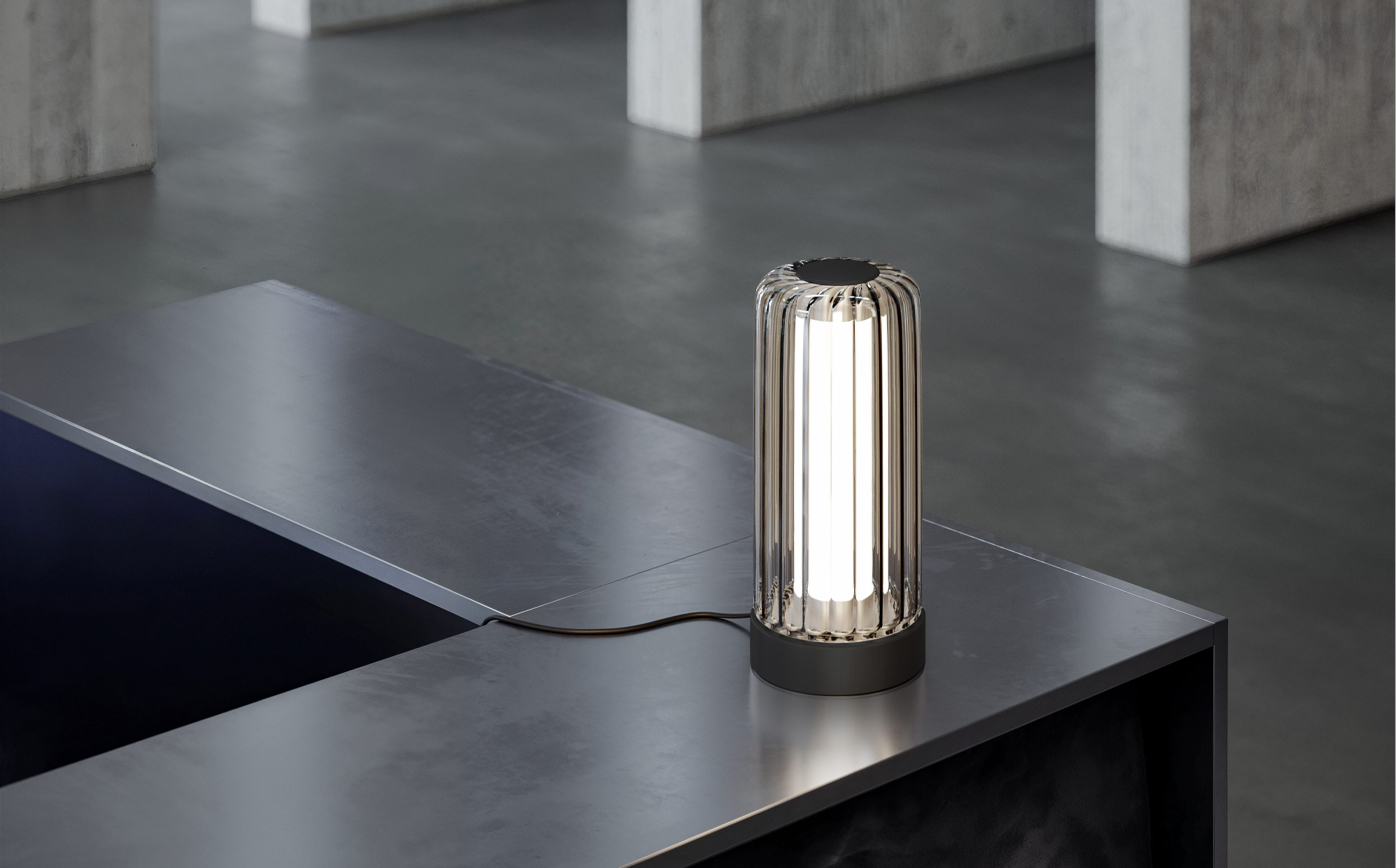 David Rockwell extends the Stacking series with a new table lamp that carries the same architectural language as its larger typologies. Stacking T translates the system into a smaller scale suited to desks, side tables, and more intimate settings. Its blown borosilicate glass diffuser, offered as a single-glass element, features a ribbed finish paired with a matte black metal structure. The transparent ribbed glass adds a defined linear texture while maintaining the series’ clear material expression. Stacking T brings the precision of the Stacking series into residential applications with a compact, considered presence.