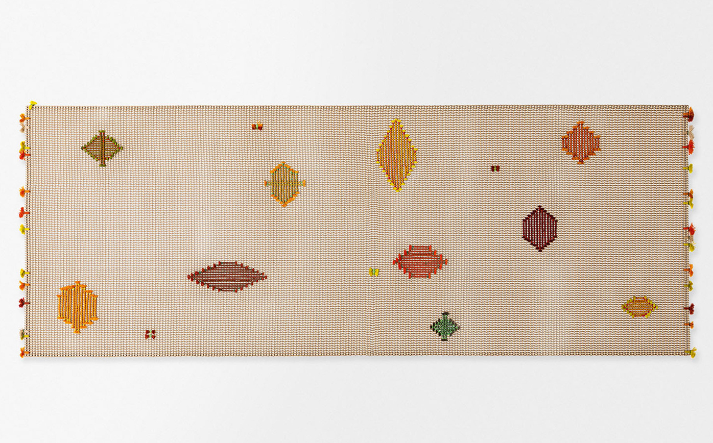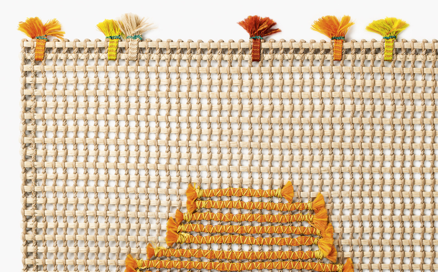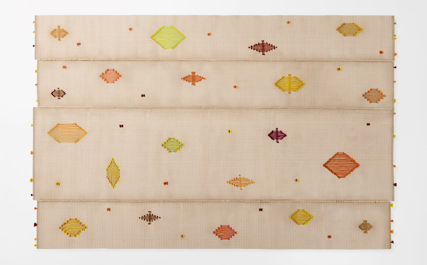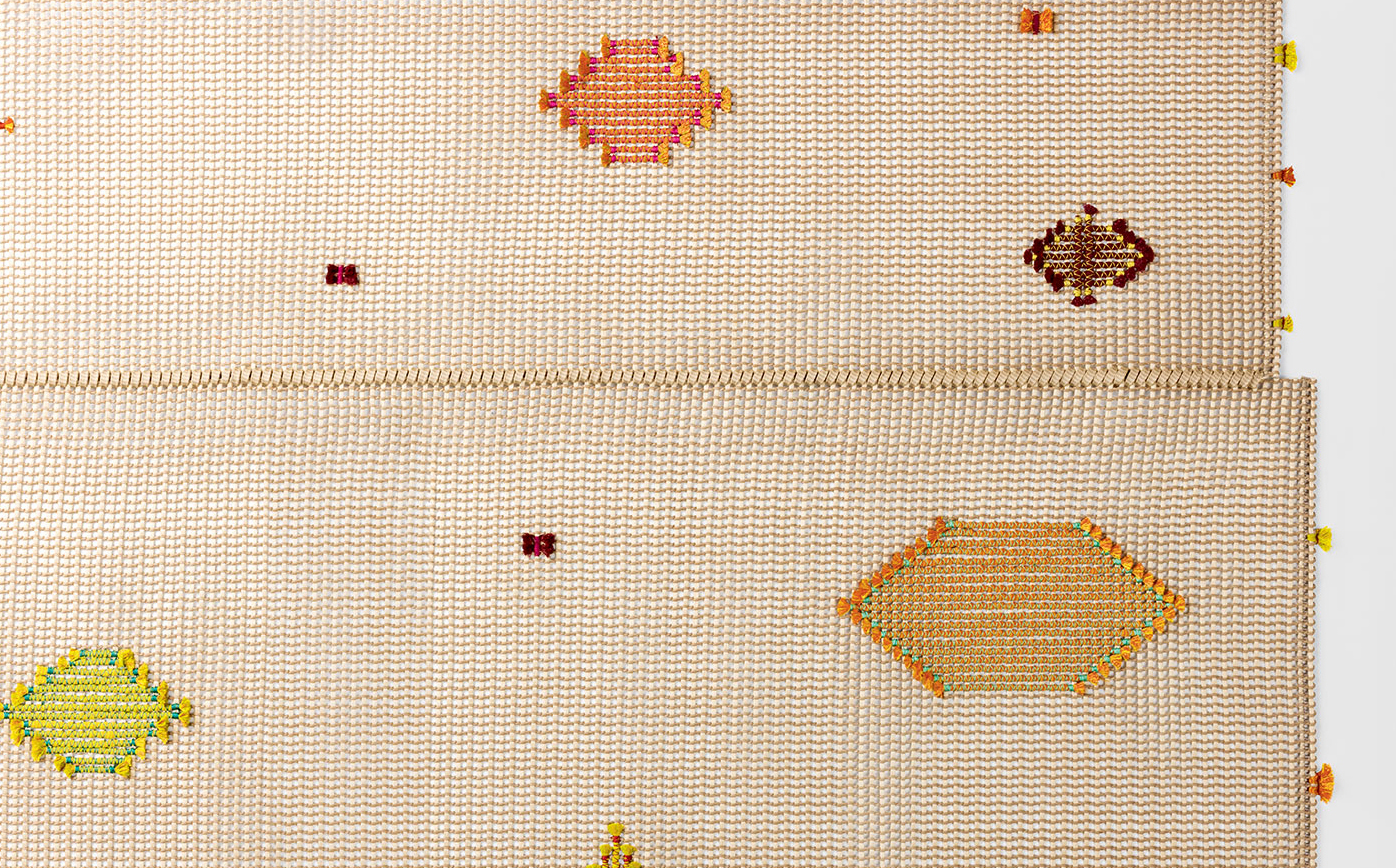 The Ayla rug is suitable for both outdoor and indoor application. The body of the rug is woven from high-tech Kymia fabric, with colourful tassels decorating the short ends. The body of the rug features a unique shape motif constructed from Rope Corda 10, and applied to the rug by hand with zig-zag stitching. Available in three sizes, both the colour of the body of the rug and the embellishing cord can be customised.