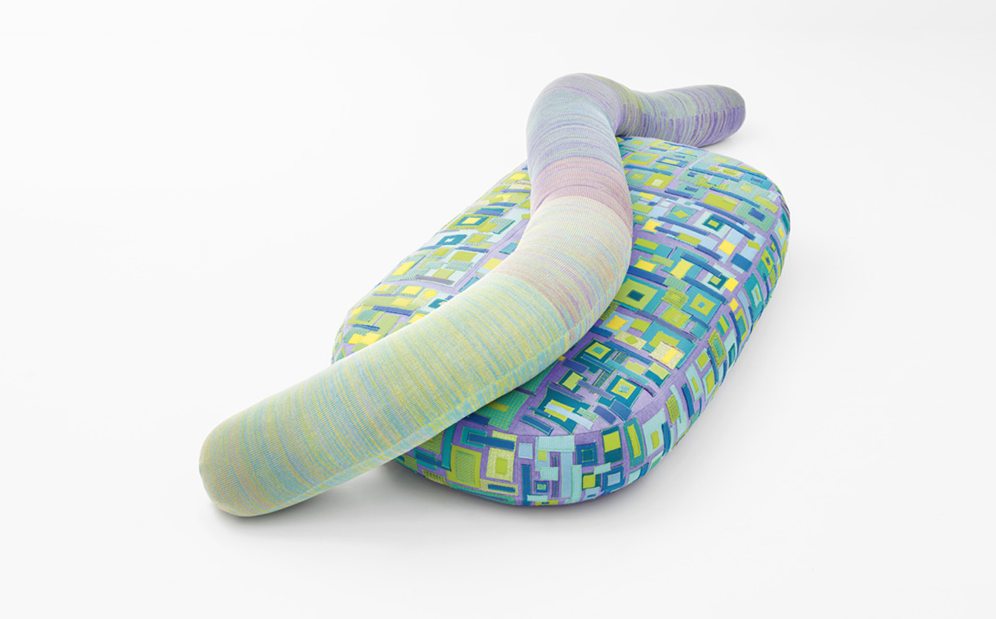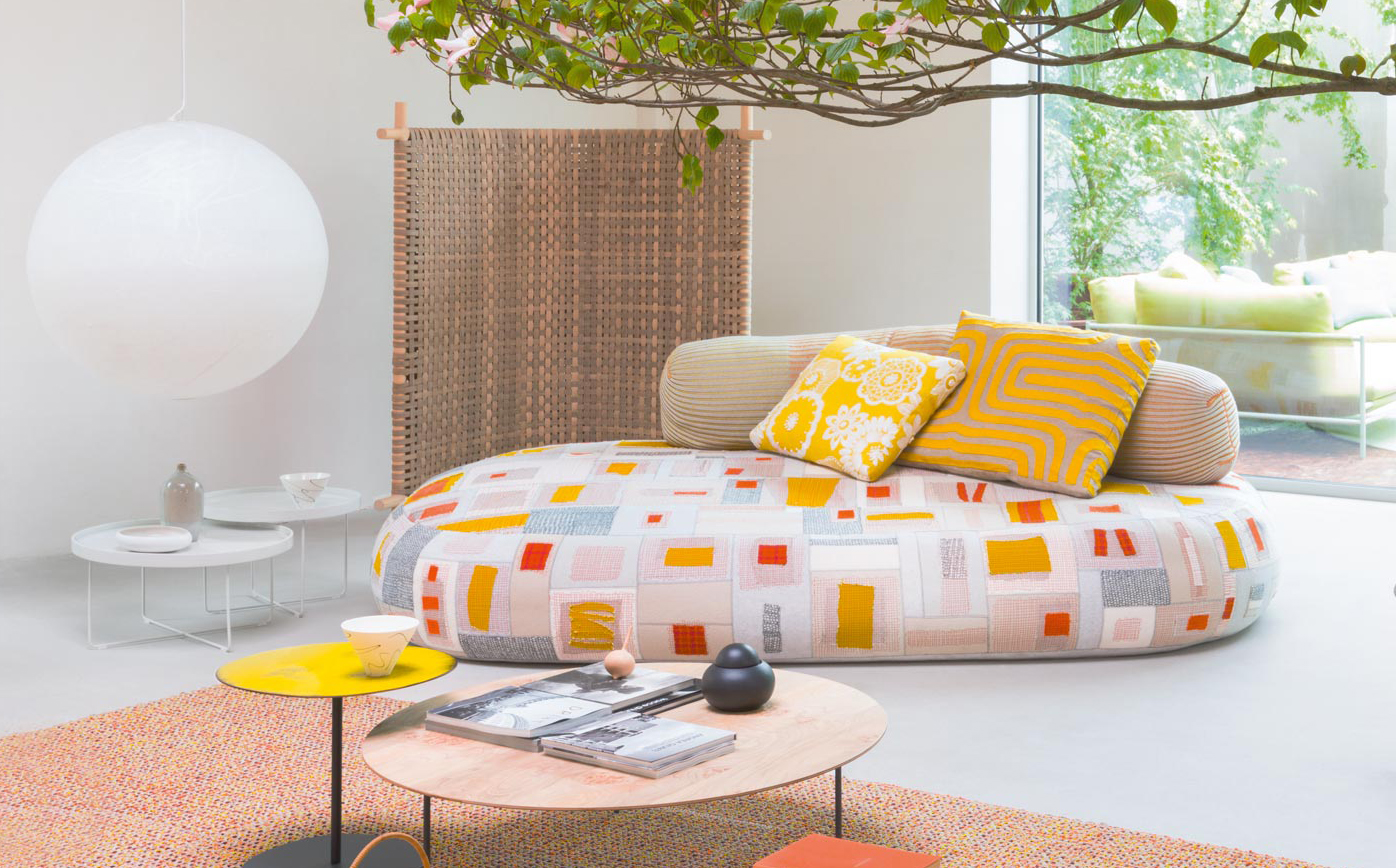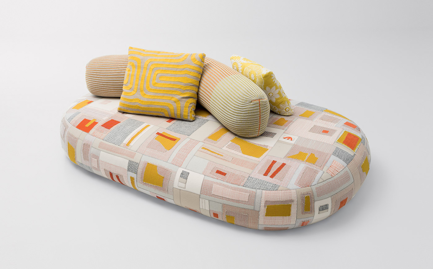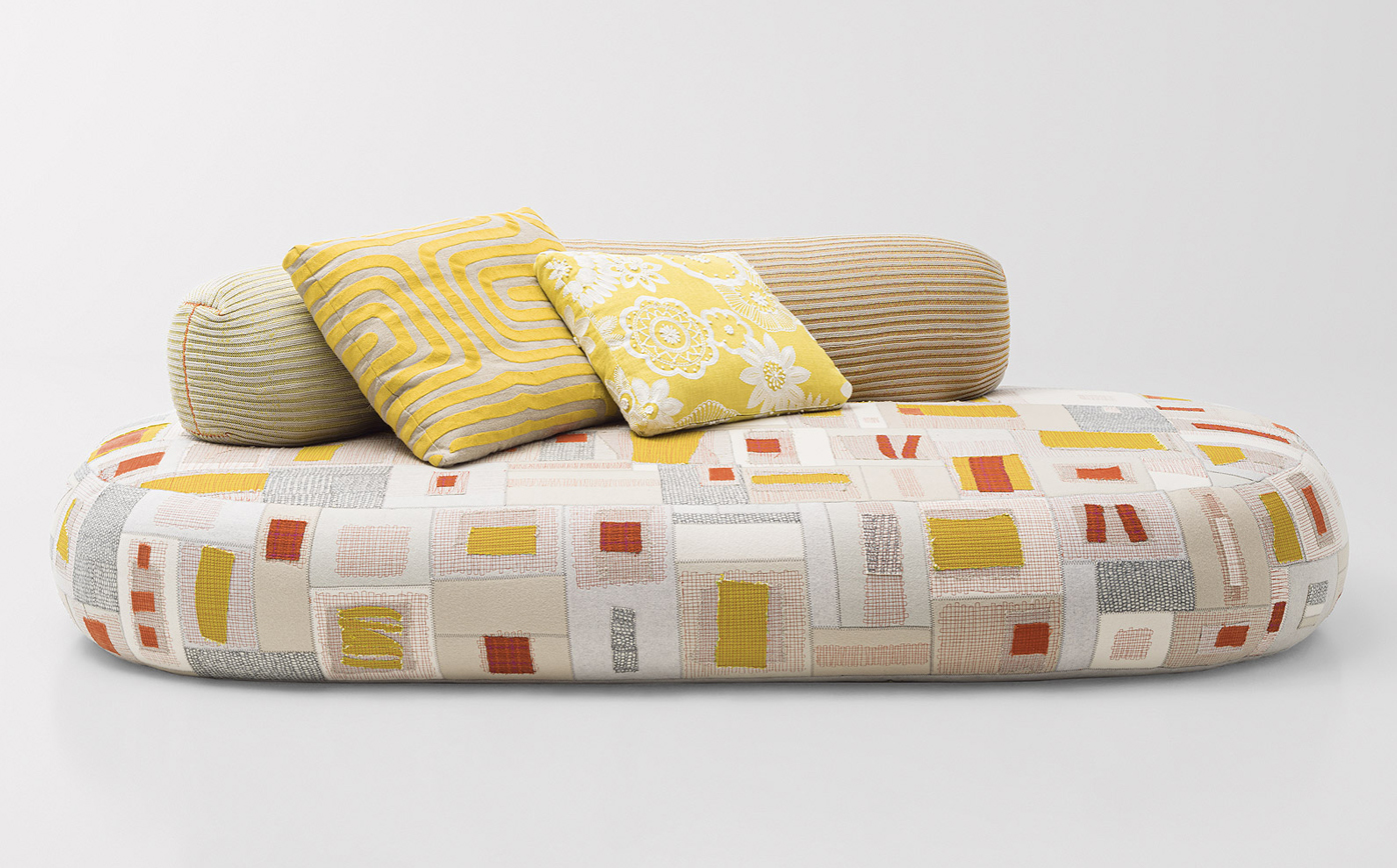 A new addition to the Metamorfosi collection, Chromodoro is a large round indoor sofa with an independent backrest consisting of a long cylindrical element. The backrest is simply laid on the seat. The platform upholstery is removable, made by sewing together elements in Paola Lenti Felt with Punto ZigZag stitch, which are then decorated with fabric appliqués and machine embroidery.