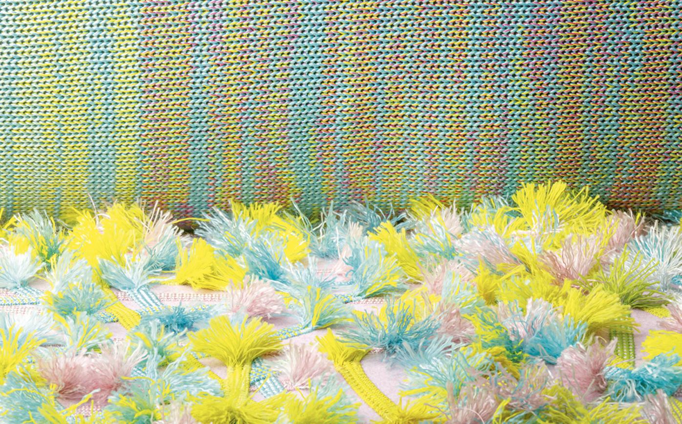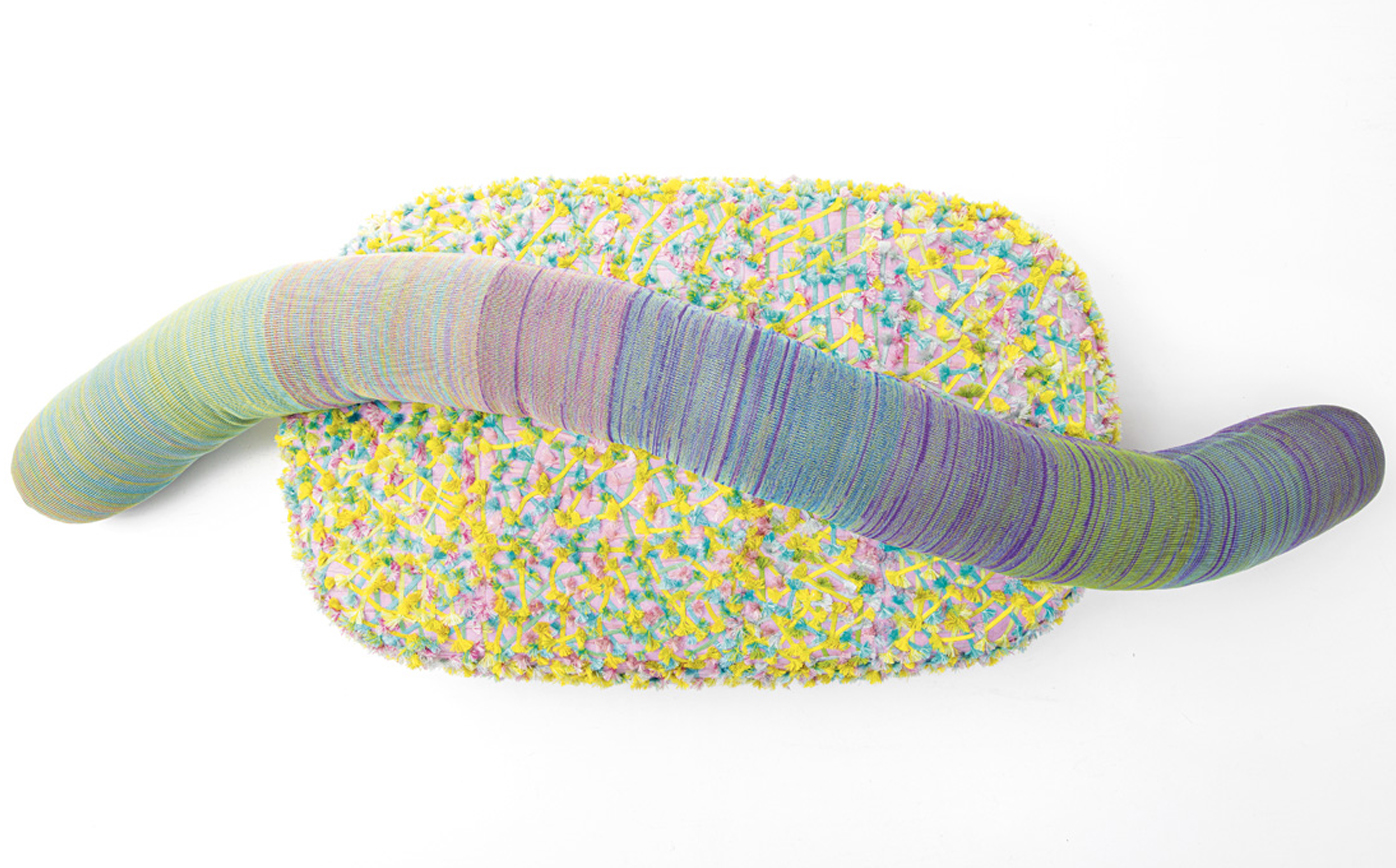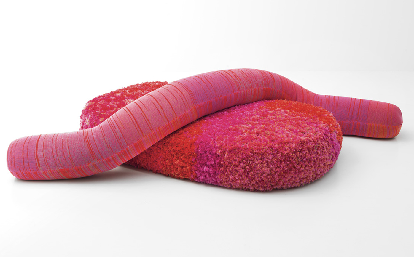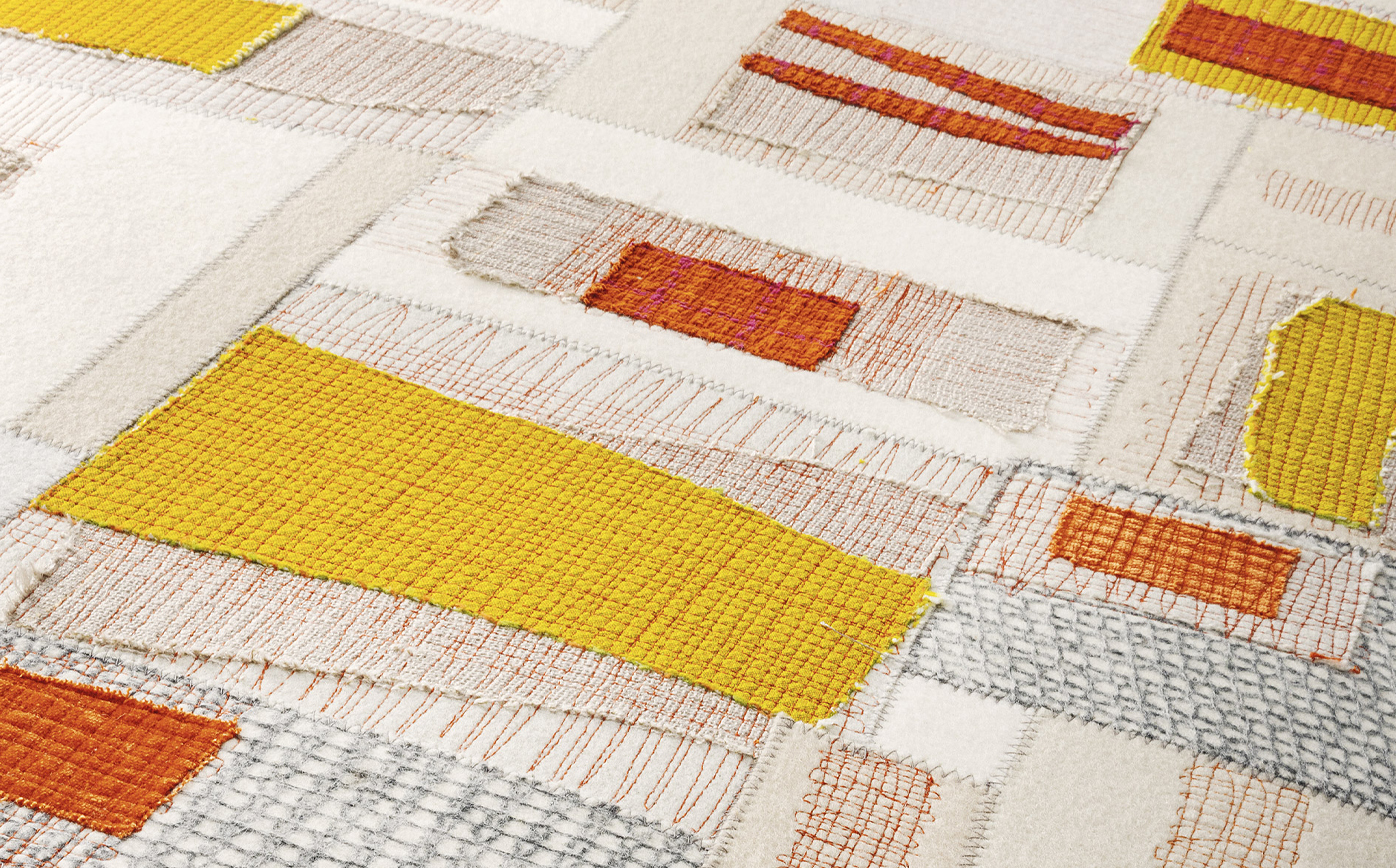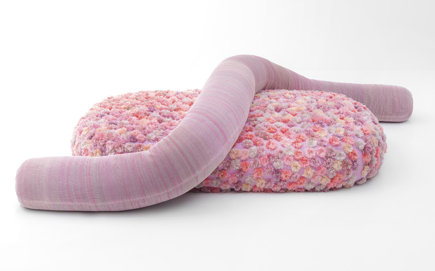 A new addition to the Metamorfosi collection, Chromodoro is a large round indoor sofa with an independent backrest consisting of a long cylindrical element. The backrest is simply laid on the seat. The platform upholstery is removable, made by sewing together elements in Paola Lenti Felt with Punto ZigZag stitch, which are then decorated with fabric appliqués and machine embroidery.