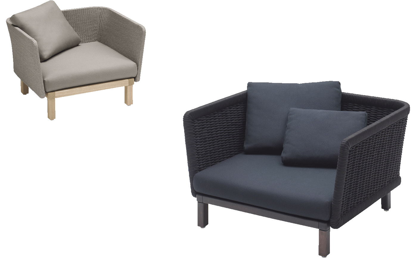 Seat and back cushions are produced with materials suited to exterior environments and can be covered with the new terry cloth Mar, available in a wide selection of colours resistant to UV rays and atmospheric agents.