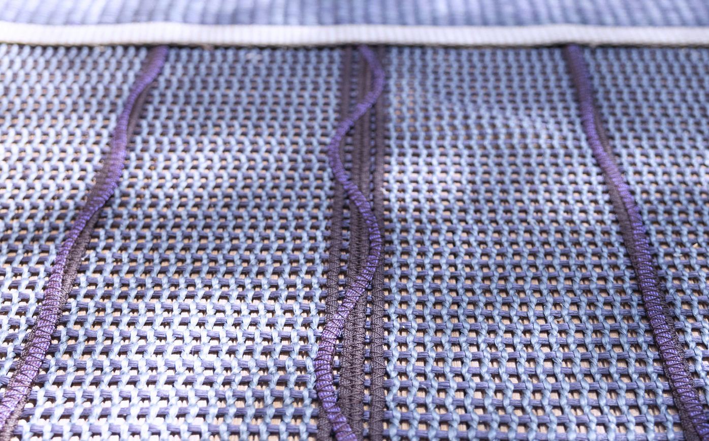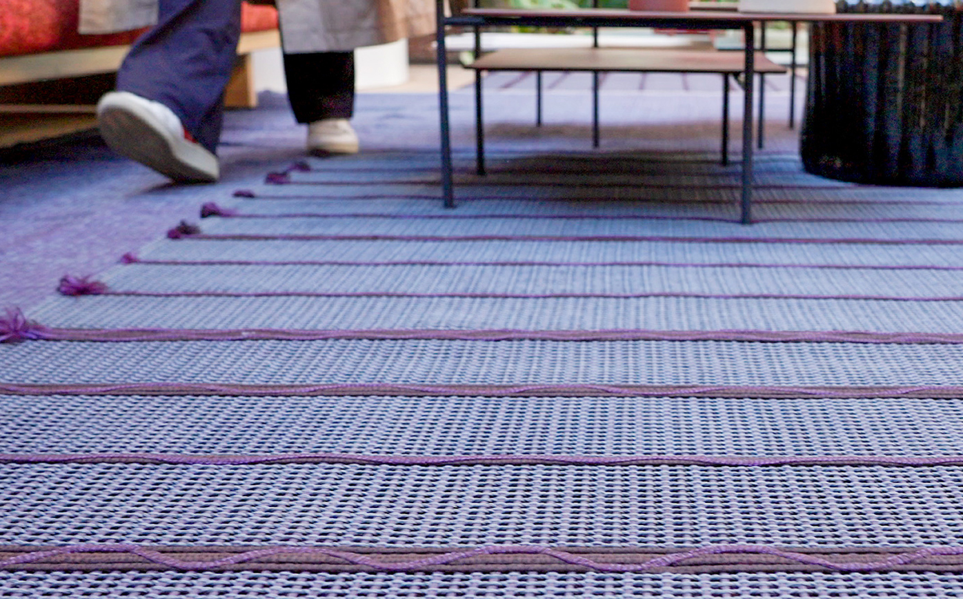 Wadi is produced by connecting 150mm strips of Kimia Woven fabric together in lengths to create a large covering. joins are made into a feature of the pattern through the addition of colourful cord and stitching application. The manufacturing process creates a unique silhouette with subtle variation around the border. Available in three sizes, one colour can be chosen for the main body, and two colours can be selected for the decorative elements. Suitable for both indoor and outdoor use.