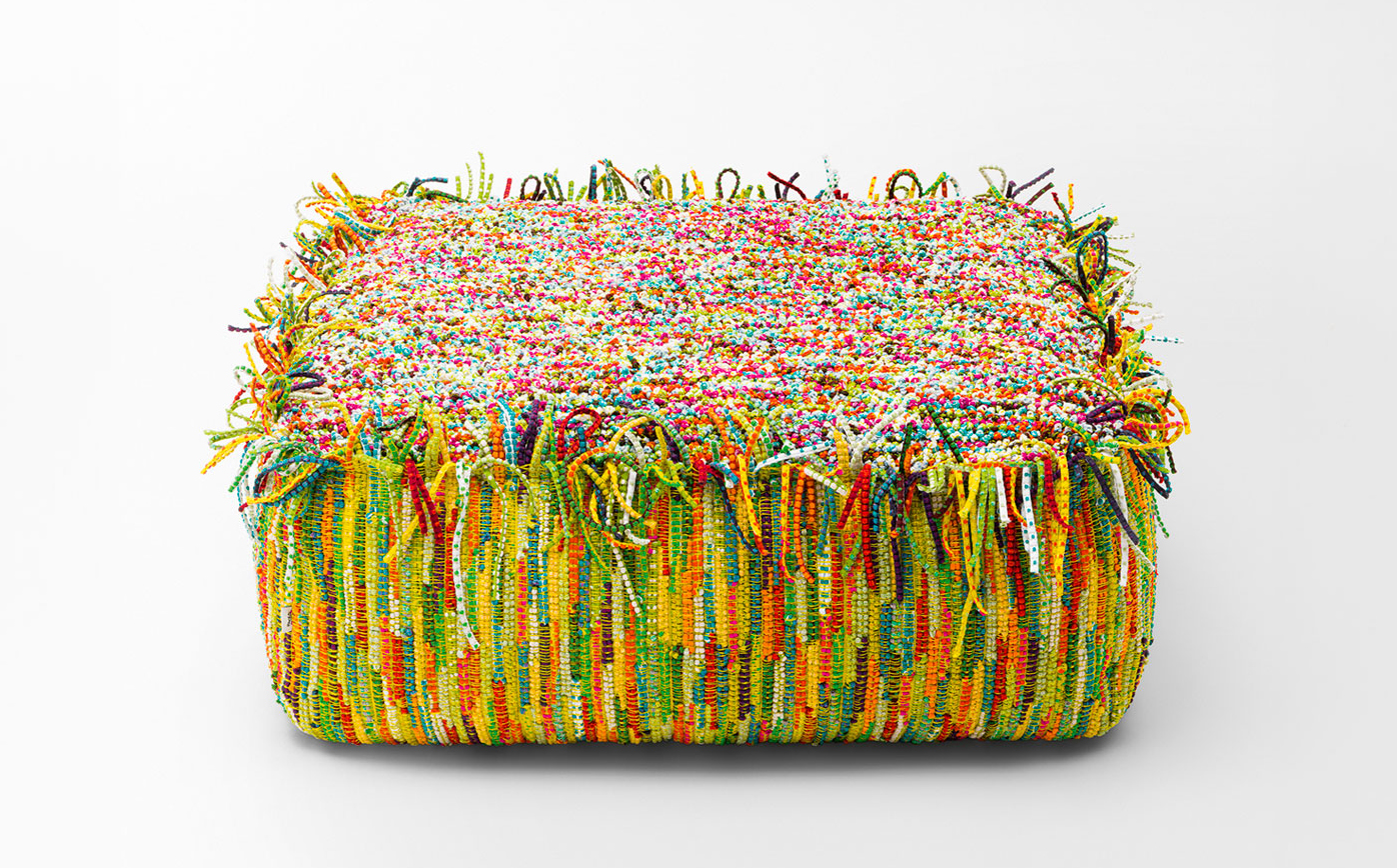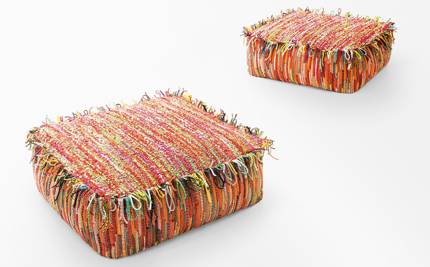 Zebrù is a ottoman characterised by a very particular covering. The internal structure, in polypropylene microspheres, is upholstered with a bouclé fabric covering hand loom woven with remnants of yarns and fabrics of the collection that remained unused from previous processing. This takes up the philosophy of “no waste” and makes these poufs an integral part of the Mottainai collection.
